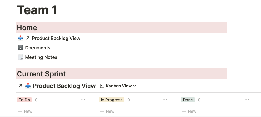 Here is a template for scrum teams on Notion. It has an overview of scrum, pages for different teams work out of with embedded product backlog and sprint tasks databases filtered by team, and a calendar for the scrum ceremonies with templates for all scrum ceremonies with meeting objectives list embedded.