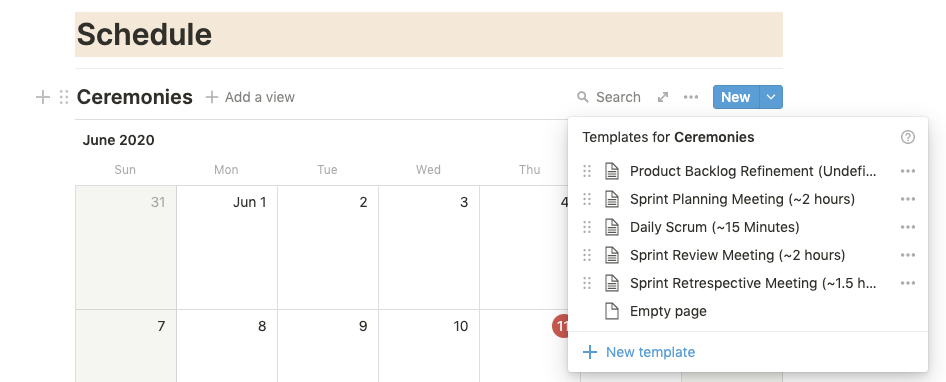 Calendar with scrum ceremony templates
